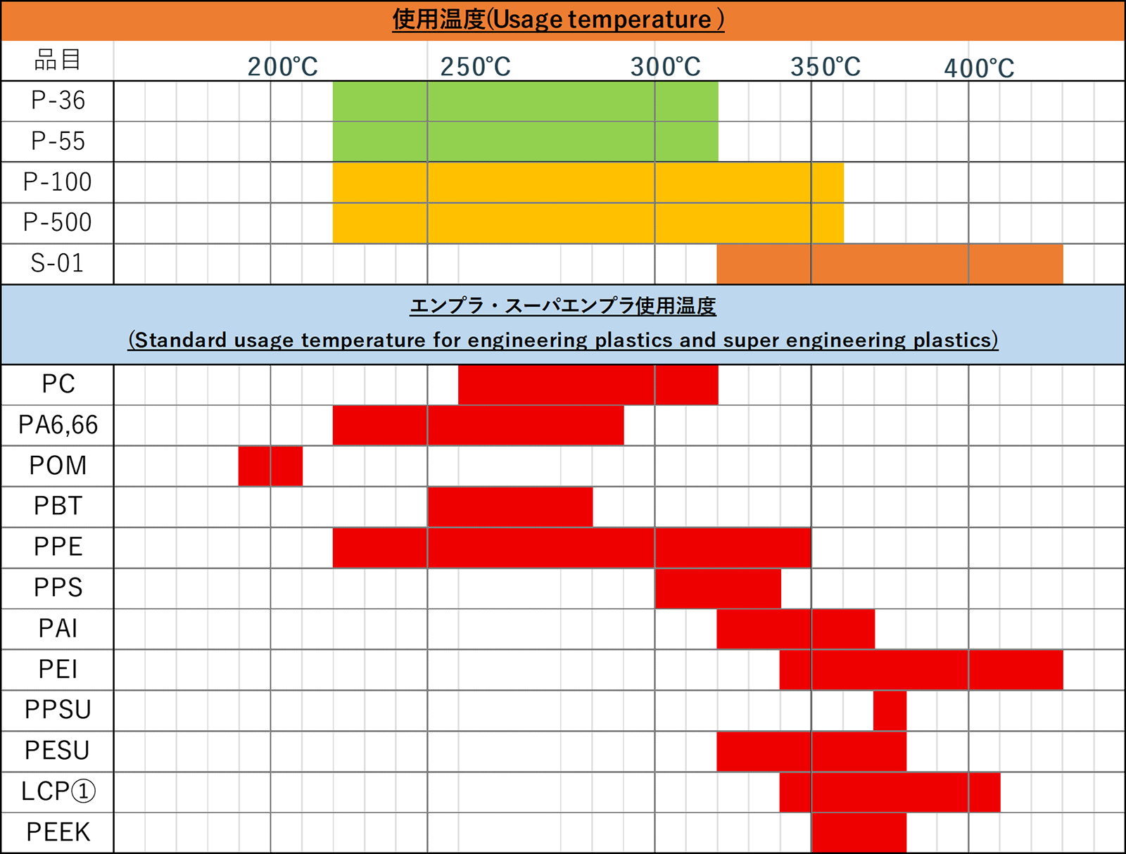 PCベースのものは220~360℃広範囲温度領域に使用可能。S-01はスーパーエンプラの温度域でも使用が可能。