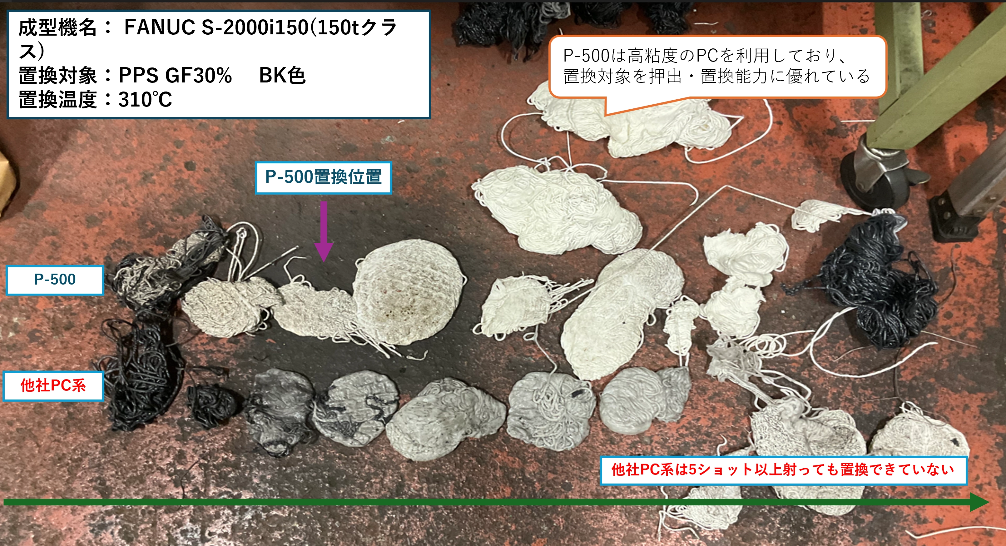 PPSのパージにおいてもP-500は3ショット目で置換できたのに対し、他社品は5ショット以上射っても置換できず、P-500の優れた置換、洗浄能力が確認できます。