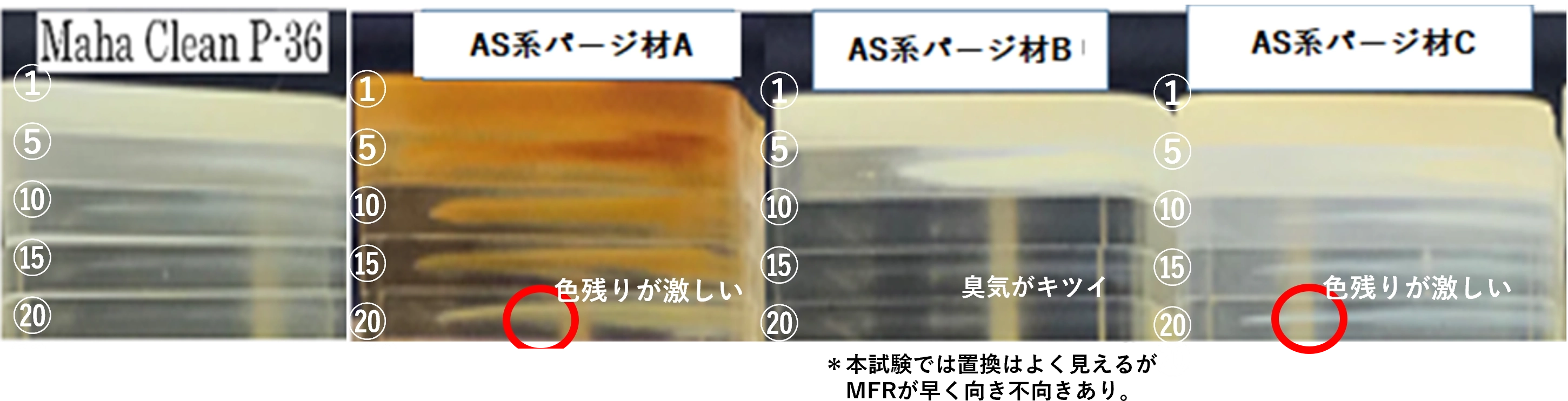 AS系パージ材A>AS系パージ材B>AS系パージ材C≧マハクリーンP-36 |