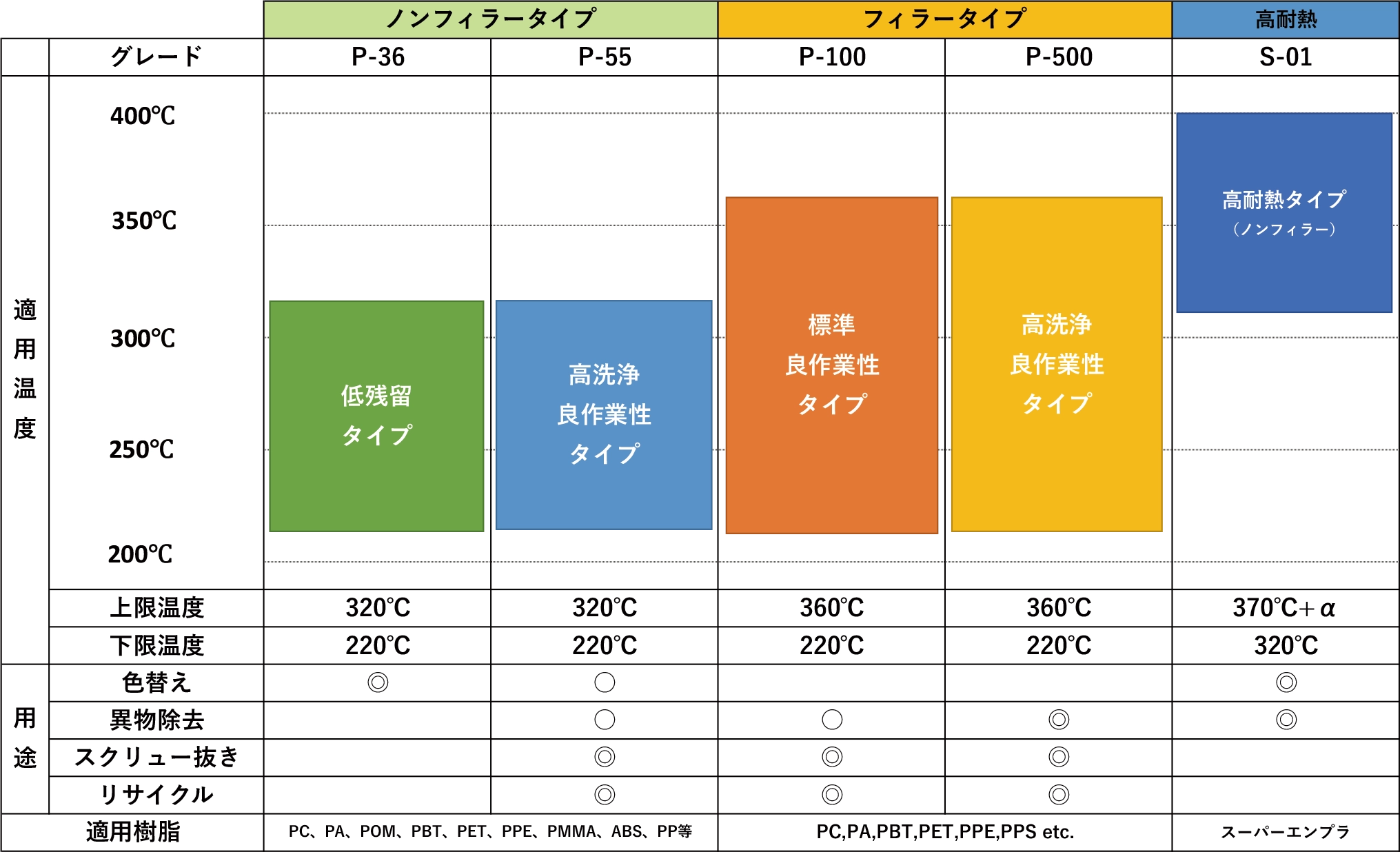 高洗浄力、高耐熱性を主な特徴としており、PCベースは220℃~360℃、さらに超高耐熱グレードのS-01は360℃以上に使用することが可能で、広範囲温度域のエンプラ、スーパーエンプラ(POMを除く)のパージに適しています。