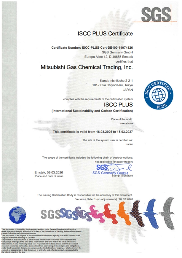 三菱ガス化学トレーディング株式会社(本社:東京都千代田区、代表取締役社長:香坂 靖、以下「当社」)は持続可能な商品の国際的な認証制度の一つであるISCC PLUS認証を2023年3月より取得しております。